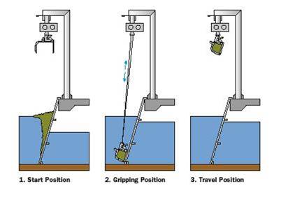 ◎抓爪單元由一系列齒條組成,它們可以通過液壓頂桿開啟或閉合。液壓油管將動力從移動小車上的液壓站傳送至液壓頂桿,油管纏繞在一張緊的鼓上,和耙斗提升裝置同步運(yùn)轉(zhuǎn)。耙斗通過裝有彈簧的擺動限位板在移動時可保持平穩(wěn)。